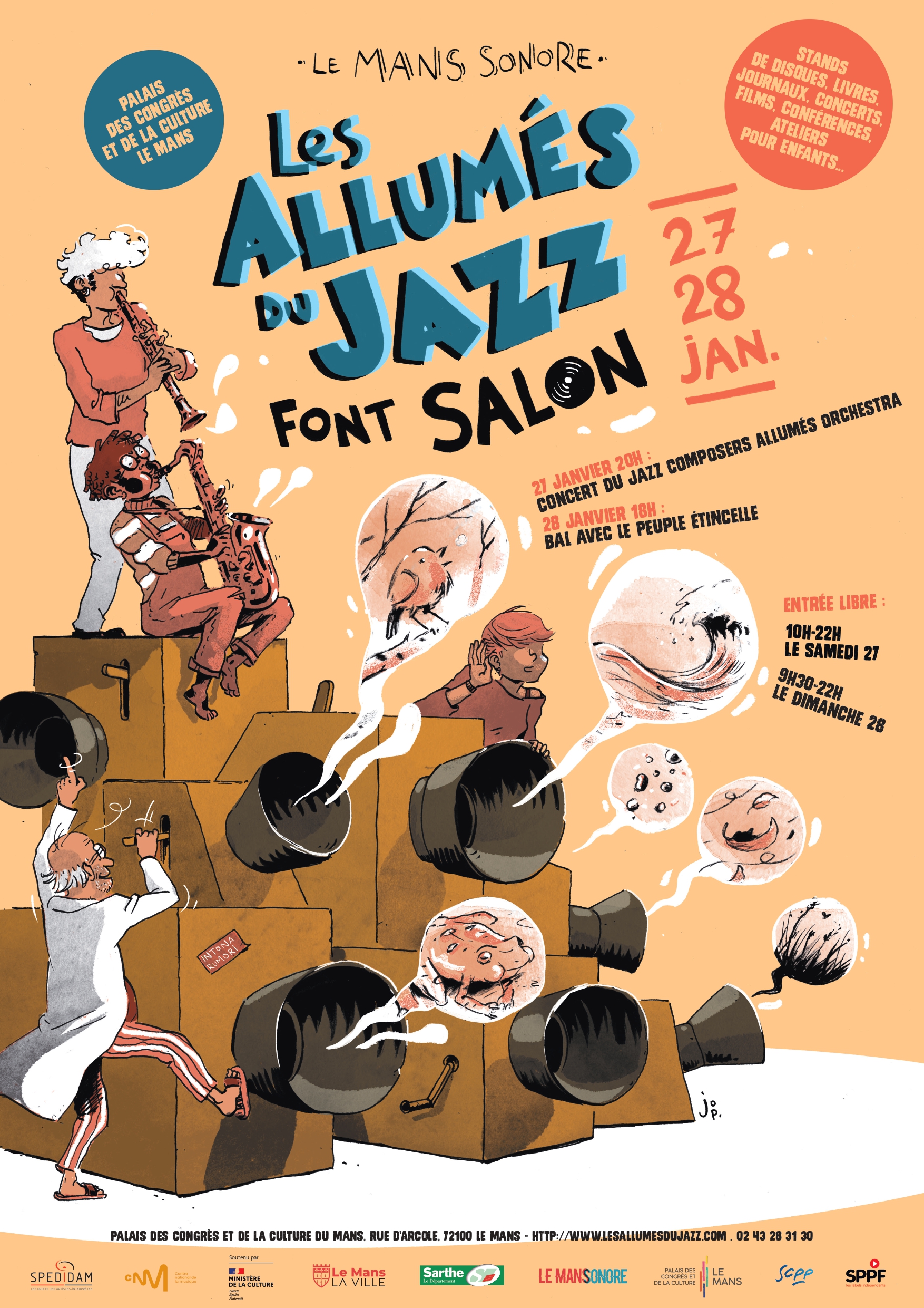 Les Allumés du jazz - bien connus par le journal du même nom - fédèrent une aussi joyeuse que furieuse cohorte de labels et maisons de disques fortement indépendants depuis 1995. Le jazz dans tous ses débords et ses réceptions tous styles jamais discriminantes ! Accueillis par la biennale du son Le Mans Sonore au Palais des Congrès les 27 et 28 janvier, les Allumés du Jazz présenteront, sur un fleuri nombre de stands, leurs accessibles productions d’éclatante diversité, ainsi que concerts, débats, conférences, et, événement non des moindres, la première publique du Jazz Composers Allumés Orchestra. Un tel salon du disque indépendant n'avait pas eu lieu depuis 38 ans !